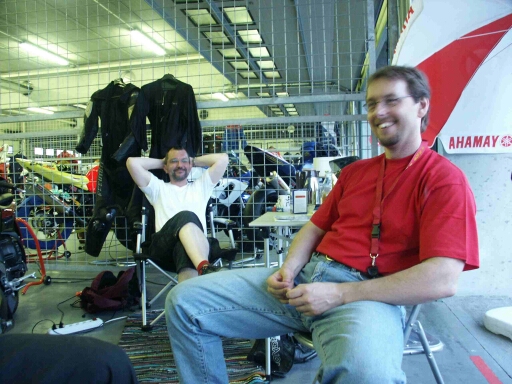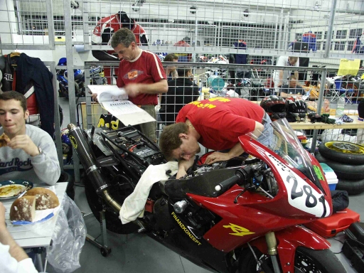 Brünn mit prospeed wurde vom Racing-Team SÖR mit etwas zwiespältigen Eindrücken angegangen, und zwar aus mehreren Gründen: Hectoro hatte nach seinem Sturz in Most noch immer einen nicht ganz ausgeheilten Bruch im Mittelfuss, prospeed wollte er eigentlich nie wieder mitfahren, da die ihn einmal in Most 10 Minuten in der Boxengasse warten liessen, weil er um 5sec zu spät zum Vorstart kam. Mein letzter Eindruck von Brünn im vorigen Jahr war auch nicht positiv, da mir am Beginn unserer tschechischen Woche, sprich am ersten Tag, das Getriebe meiner damaligen Honda kaputtging. Trotzdem machten wir uns an die nicht ganz kurze Anreise und wurden auch prompt durch perfekten Verkehr bis kurz vor Dresden belohnt. Das Wetter war für die Anreise in Ordnung und so hatten wir die Hoffnung um 18 Uhr in Brünn aufzuschlagen. Aber nachdem wir die Autobahn verlassen hatten, ging die Odyssee los. Laut Karte konnten wir ein paar km sparen, indem wir eine Nebenstrasse an Freital vorbei nehmen würden. Guter Ansatz, schlecht in der Praxis, die Nebenstrasse war eine Schaukelpiste vom Feinsten und hier hat wahrscheinlich auch meine R1 einen Wackelkontakt abbekommen, von dem ich noch Alpträume kriege sollte. Irgendwann waren wir dann jedoch wieder auf der Bundesstrasse Richtung Zinnwald und wollen schon aufatmen, als wir uns in einem ca. 10 km langem Stau befanden, den der Radioversager noch nicht mal erwähnenswert fand. Ohne Fahrtwind wird's in einem Transit ganz schön warm und so schwoll mir schön langsam der Kamm. Der Grenzübergang war unproblematisch aber auch die Tschechen taten noch einiges gegen meine Laune, indem sie die Autobahnen ziemlich dicht mit Baustellen machten. Nach insgesamt 13,5 Stunden waren wir dann nun endlich in Brünn angekommen und konnten unsere Klamotten ausladen. Guido und Heike kamen nach ähnlicher Tortur auch irgendwann an und man konnte sich schön langsam den schönen Dingen des Lebens widmen, was Guido so auslegte ;-)) Quax, der schon seit 4 Tagen vor uns da war, war auch noch gut gelaunt und so wurde noch bis 0:30 Uhr ein bisschen fachgesimpelt und dann die Nachtruhe beschlossen. Am ersten Tag war dann wie immer ein bisschen Nervosität angesagt und ich