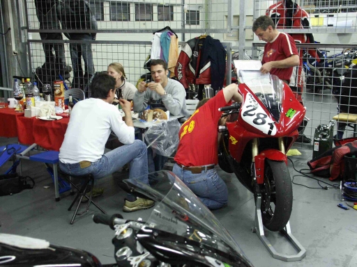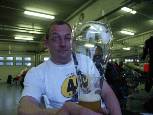 eine 2:19.69 *SCHONWIEDERJUBEL*. Tobi aus unserer Box war etwas mehr angepisst als ich, der hatte sich bei Wilbers eine neue (bessere) Feder für seine R6 bestellt, aber irgendwie mussten die seine Gewichtsangabe ignoriert haben, weil das Ding war noch härter als meine R1, und die ist schon schwer an der Grenze. So zerstörte er seine Hinterreifen innerhalb eines Tages und pumpte um den Kurs, dass einem schwindlig wurde. Am Abend wurden dann wieder einige spassige Geschichten erzählt, nur Hectoro war ein bisschen angepisst, weil er wegen seiner Verletzung nicht ganz mithalten konnte, und Quax war leider sehr wortkarg, wollte nicht mehr weiterfahren und war schon im Gedanken beim Verkauf seiner R1, weil er sich nicht mehr verbesserte, kein Wunder nach 5 Tagen Rennstrecke wär bei uns allen die Luft raus. Aber mittlerweile ist er schon wieder obenauf und überlegt, ob er für Oschersleben melden sollte :-) Am dritten Tag war ein 20 Runden-Rennen angesetzt, was zwischendurch auf 16 Runden reduzuert wurde, also Zeittraining in Angriff nehmen und wieder war ich schnellster MOFler, daran kann man sich gewöhnen *gg* Doch wie schon in Most meinte es der Wettergott wieder nicht gut mit uns und exakt 10 Minuten vor dem eigentlichen Start waren dicke Regentropfen zu sehen und das Wetter wurde als Wet-Race deklariert und 20 Minuten verschoben. Im Gegensatz zu Most bin ich jedoch zur Startaufstellung, habe die Warm-Up-laps gefahren und dann erst entschieden NICHT mitzufahren, da es an 3 Stellen, wo man mit richtig Pfeffer daherkommt, noch nass war. Hectoro und Stephan taten das Gleiche, nur der Bub fuhr das Rennen und wurde auch noch mit Pokal belohnt. Ich hatte mein MÄDCHEN T-SHIRT ja dabei und wurde diesem (leider wieder einmal) voll gerecht, aber irgendwann haben wir auch mal eine komplett trockene Veranstaltung. Christian hatte in seinem Rennen mehr Wetterglück und konnte, wie am Tage zuvor schon einen 7.Platz und einen Pokal einfahren. Nach diesen unterm Strich hervorragendem Ergebnis (ALLE UND ALLES HEILE GEBLIEBEN) machten wir uns noch auf die Rückreise, die durch bessere Routenwahl für alle besser verlief und wissen, dass im August beim MOFler-Cup mächtig Spass auf uns wartet. CU on Track