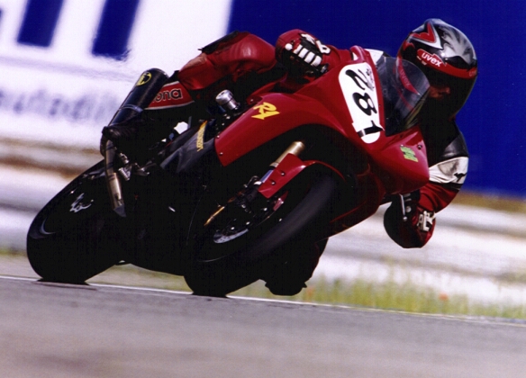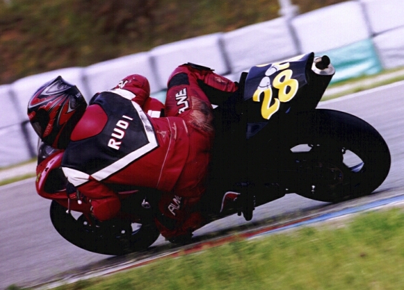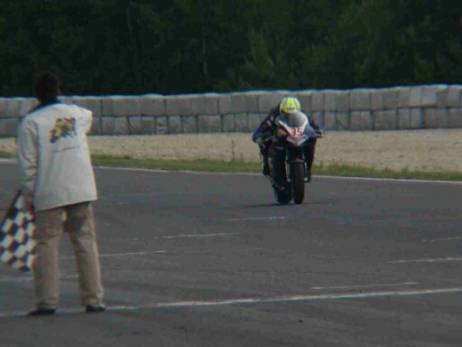 Scheisse wie vorher. Am zweiten Tag, nachdem ich mich eigentlich schon auf ein zickiges Mopped eingestellt hatte, war alles in Ordnung, scheinbar war wirklich nur ein fehlerhafter Kontakt schuld an dem Debakel. Mit diesem Hoch, was mir unerwartet ins Haus stand, konnte ich dann auch das Zeittrainng angehen, wo Hector und Heinz vor mir auf die Strecke gelassen wurden. Ich dachte noch Klasse, da kann ich versuchen mich anzuhängen und bog mit etwa 100 Meter Abstand in die schnelle Rechts nach Start-Ziel. Beim Anbremsen der nächsten Kurve war ich aber schon fast an den Beiden dran und so musste ich zuerst Hectoro und dann Heinz versuchen zu überholen, was zwar klappte, aber trotzdem Zeit kostete. Hinterher stellte sich raus, dass Heinz mit Serien-Bremsbelägen unterwegs war, die kaum mehr richtig funktionierten, trotz dem zu späten Überholmanöver hatte ich eine 2:20,48 im Qualifying stehen, und war schnellster MOFler *JUBEL* Am Nachmittag war dann das Rennen angesetzt und hier hatte ich einen sehr