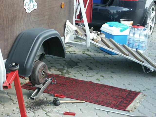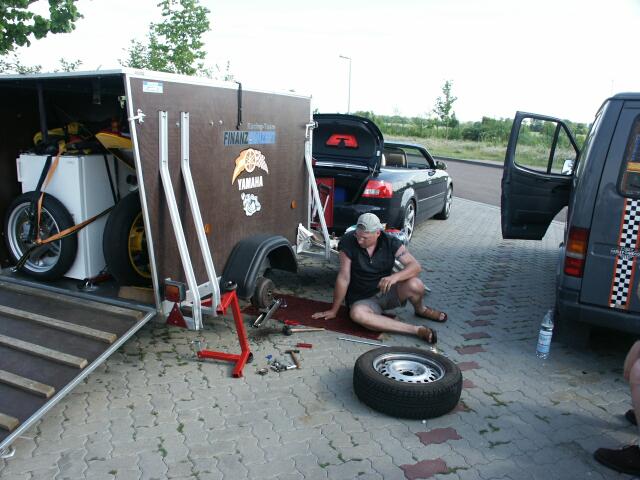 rauchte ein bisschen :-(( AUSSEN HUI und DRUNTER PFUI !!!! Mein spanischer Teampartner hat wohl mehr mit der Optik als mit der Technik seines Hängers verbracht und so wunderte es nicht, dass unterhalb die Bremstrommeln eigentlich nur aus Rost bestanden, eine Bremse war fest und mit dieser Analyse ging's dann an die Behebung des Schadens, wobei wir noch Gesellschaft von ein paar Rentnern bekamen, welche gerade ein Kaffeekränzchen auf dem Parkplatz abhielten. Und trotz besserwisserischer Tipps der grauen Panther verlor DHS das Ziel nicht aus den Augen und bekam die Möhre wieder hin. Nach nun reichlich Verspätung hinter dem ursprünglichen Zeitplan ging's dann ohne weitere Probleme Richtung Most, wobei wir hinter Chomutov die "Strasse" und die "Autobahn" (hier würde man Feldweg sagen) nutzten, um noch etwas Zeit herauszuschinden, das Ergebnis waren springende Hänger bei 120 km/h, und wahrscheinlich wurde dabei auch die Milch (Öl) im Euter der Kuh sauer, dazu aber später mehr. Die Anmeldung ging dann mit Bezug der Box gerade noch vor 22 Uhr über die