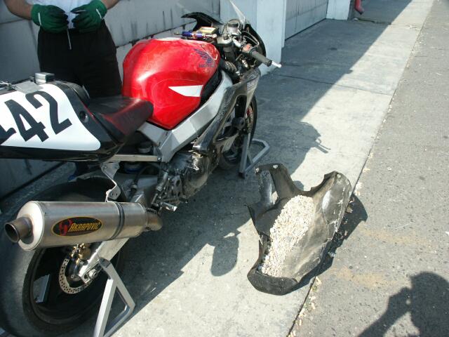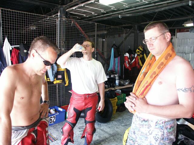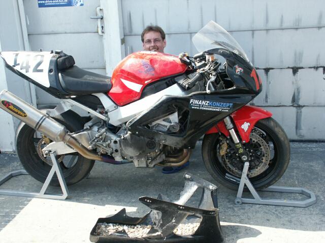 Bühne und wir konnten dann erst mal entspannt den Abend ausklingen lassen. Gesagt, getan, zweiter Tag, erster Turn, Mayr zieht am Kabel in Richtung Start-Ziel-Kurve, anbremsen mit vorne und hinten, und mit etwa einem halben Meter Schlingeramplitude am Hinterrad in Richtung Kies, und nachdem mich der Reifenstapel unfreundlich angeschaut hat, auch noch das Mopped zur Seite gelegt. Nachdem ich mit meiner Beglückwunschungsorgie für mich selber in Form von "DU IDIOT" u.ä. fertig war, konnte ich aber keinen Schaden am Mopped entdecken und nach dem Ende des Turns sprang die CBRRR sogar wieder an und ich konnte mit Schleiflauten in die Box fahren. Dieser Showeinlage folgte natürlich sofort die Nächste in Form von Das Kiespetting hat mein Mopped so etwa 10 kg schwerer gemacht, also musste die Verkleidung runter und der Schotter aus den Innereien. Dies habe ich jedoch mit Bravour bestanden und nach ca. 5 Stunden (so kam's mir vor) konnte ich wieder weiterfahren, mit Hilfe von Hector's Dremel auch wieder ohne Schleifgeräusche. Da dachte ich noch, dass DHS die Most-Seuche an mich weitergegeben hat, aber leider weit gefehlt. Der Tag ging noch spassig mit diversen Rangkämpfen auf der Strecke zu Ende, wobei speziell Volker ein leichtes Opfer in der Spitzkehre war, da er sich standhaft weigerte, diese im 2.Gang zu fahren, und weil er uns dies am Vorabend verraten hatte, wussten wir, dass er traktorähnlich mit seiner Mille aus dieser Ecke im 3.Gang rauskam. Jörg war am Ende nicht mehr so einfach zu kriegen, er fuhr genauso wie ich auch 1:43 als schnellste Runde. Ein R6-Fahrer wollte anfangs der KUH-S'es (Geschlängel vor der Spitzkehre) an mir innen vorbei, wobei das mit Kiespetting seinerseits ausging, weil ich da nur die spitze Linie hinkriege, und deswegen kaum eine spitzere Linie möglich ist. Am Foto sieht man meine Überlegenheit *gg*. Nachdem DHS dann wieder auf der Strecke liegen blieb, dachten wir schon, dass er das mit der Reserveleuchte nie lernt, aber sein Gesicht verriet, dass diesmal der Schaden gröber war, ein kapitaler Motorschaden, wie sich herausstellte. Nach langem Überlegen entschloss er sich dann, am nächsten Tag mit Moni zurückzufahren und bei Jura einen Gutschein anzufordern. DA WAREN'S NUR NOCH ZWEI :-(( Der nächste freie Tag war regnerisch und so verbrachten Hector und ich die