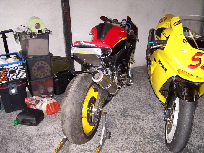 Das wär ja noch zu verschmerzen gewesen, aber Hectoro humpelte schon übel und ich fuhr hinter dem Rettungswagen dann mit ins Krankenhaus nach Most. Gottseidank haben die dort einen Dolmetscher, denn als ich im Krankenhaus mich nach der Aufnahmestation erkundigte ernetete ich nur ratlose Gesichter. Schlussendlich fand ich dann den Bruchpiloten mit Begleiter und nach einer Stunde waren zwei Dinge klar: Die Krankenschwesterschülerinnen im kurzen Rock sind GEIL anzusehen, aber leider auch Hectoro's linker Mittelfussknochen ist gebrochen :-(( Damit war schon mal ein kleines Stimmungstief zu verzeichnen und wir dackelten wieder Richtung Autodrom. Dort setzte sich der Spanier mal in einen Stuhl um uns dann mit Kommandos wie, "Kannst du mir mal eine Socke bringen" bis zu "Ich möchte gerne einen Kaffee" zu nerven ;-)) Am Nachmittag bin ich dann irgenwie schaumgebremster auf die Strecke um kurz darauf von DHS die nächste Hiobsbotschaft zu hören, nämlich "MEIN GETRIEBE IS KAPUTT". Der schön wieder aufgebaute Zylonenkreuzer hat somit innerhalb kürzester Zeit wieder den 3. Gang verloren und die Beiden beschlossen, noch am Abend nach Hause zu fahren. Um den Tag zu retten habe ich wenigstens im freien Fahren dann Uli linksherum überholt, damit er wenigstens einen Stinkefinger gesehen hat *grins*. Gegen Abend kam dann auch noch Guido, der sich erstmal die Schadensmeldungen schildern liess, bevor er sich das eine oder andere Weizen reinzog. Seine R1 war von Rijeka auch nicht ganz heile zurückgekommen, die Gabel war krumm. So versuchte er durch Testen an meinem Mopped eine Grundeinstellung für seine Dämfung hinzukriegen, wobei er meine Gabel als megahart beschimpfte, aber ich würd's ihm schon noch zeigen *gg*. Am zweiten Tag fuhren wir dann mal raus, wobei ich durch meine schnelle erste Runde immer einen Riesenabstand herausfuhr und wir deswegen nicht wirklich gemeinsame Runden drehten. Guido war aber auch dann anfangs ständig mit Einstellarbeiten beschäftigt und so fuhr ich meine Runden relativ locker. Ein bisschen war ja noch Zeit bis zum Qualifiying für's Zeittraining. Dieses fiel dann aber am Nachmittag ins Wasser und wurde auf den nächsten Tag verschoben. Uli wollte vor dem Regen auch noch eine letzte Runde drehn, startete sein Mopped, ein komisches Geräusch, stellte das Ding wieder ab und meinte "Das hört sich aber nicht gesund an" und packte ohne weitere Fehlersuche einfach ein, weil er am Wochenende private Verpflichtungen hatte. Der Abend war dann schon unangenehm kalt und bei geschätzten 3°C zogen Guido und ich uns in die Box zurück, welche nun sehr luftig bestückt war mit nur 2 Moppeds.
