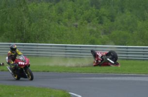 DHS hatte mit einem der beiden Jungens auf der Rennstrecke Kontakt und erzählte was von "richtig schnell". Im dritten Turn dann beim Rausfahren waren die Tschechen vor uns und ich dachte, schaun mer mal, was die so drauf haben. Nachdem ich sowieso in der ersten Runde sofort am Kabel ziehe, konnte ich dem ersten Tschechen noch locker folgen, in der zweiten Runde zog er mir aber irgendwie Meter um Meter davon und ich beschloss mein eigenes Tempo zu fahren. Einige Entfernung hinter mir begann aber das Unglück seinen Lauf, Hectoro hatte den zweiten Tschechen vor sich und wollte ihm natürlich auch folgen. Wahrscheinlich hat er sich diesen Sturz hier zu genau angesehen und er wollte das auch mal probieren :-((