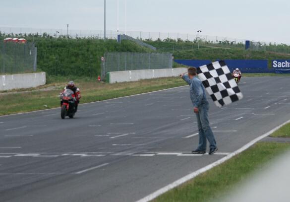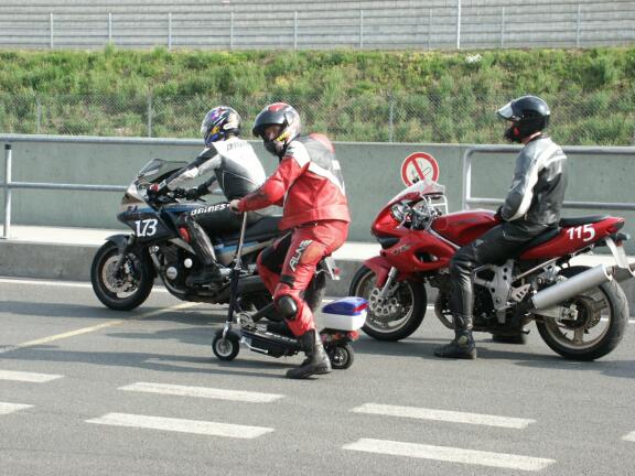 Nach gelungener Operation war dann auch wieder das Gewackel auf der Geraden weg, was mir einiges an Vertrauen (und Rundenzeit) brachte. Trotzdem konnte ich mich für das Rennen nur im Mittelfeld qualifizieren. Thomas war zwar einen Platz vor mir, aber ein Ducati-Schwuchtel fuhr ihm vors Vorderrad, und er musste mit einer üblen Prellung zu Boden, weshalb er beim Rennen aussetzte.